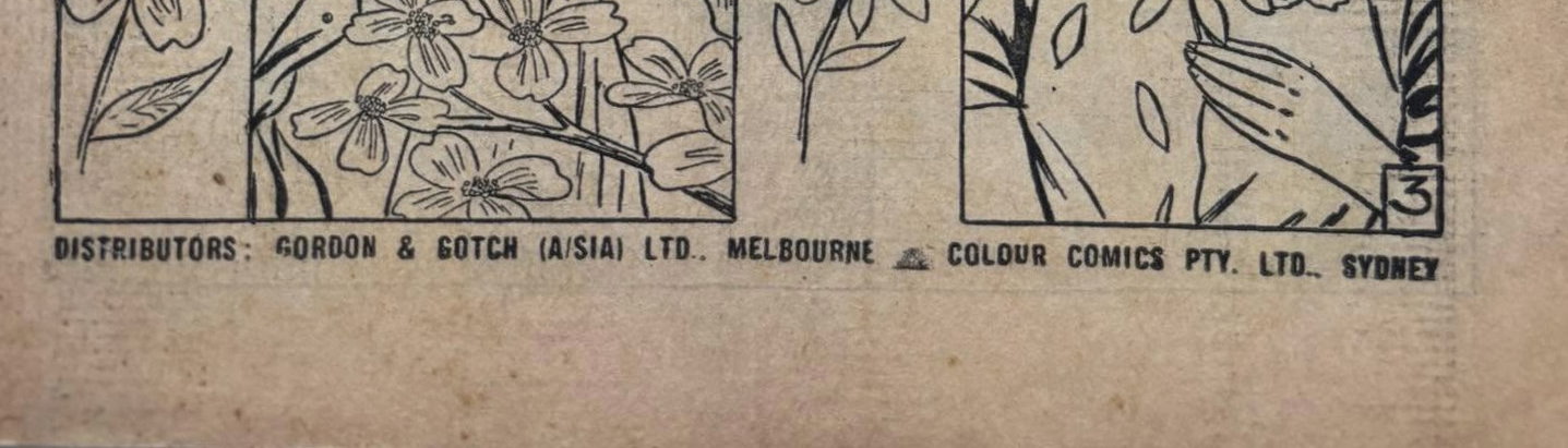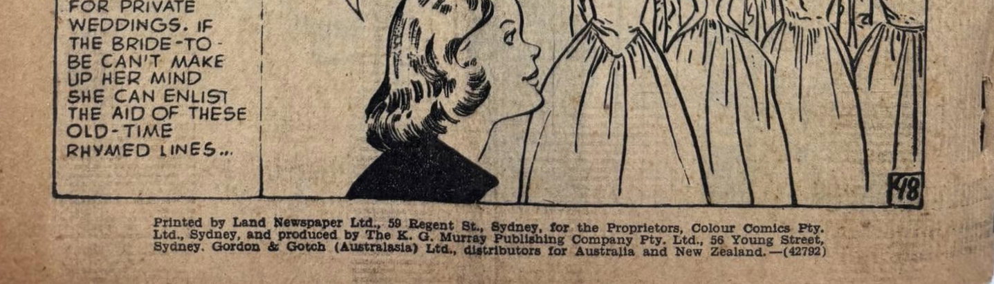 Printed by Land Newspaper Ltd., 59 Regent St., Sydney, for the Proprietors, Colour Comics Pty. Ltd., Sydney, and produced by The K. G. Murray Publishing Company Pty. Ltd., 56 Young Street, Sydney. Gordon & Gotch (Australasia) Ltd., distributors for Australia and New Zealand.--(42798)