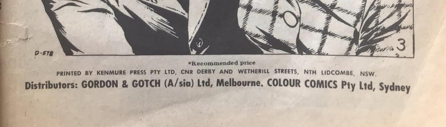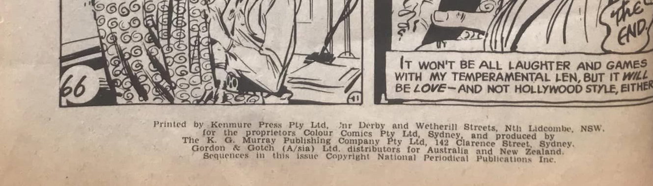 Printed by Kenmure Press Pty Ltd, Cnr Derby and Wetherill Streets, Nth Lidcombe, NSW, for the proprietors Colour Comics Pty Ltd., Sydney, and produced by The K. G. Murray Publishing Company Pty Ltd, 142 Clarence Street, Sydney. Gordon & Gotch (A/sia) Ltd. Distributors for Australia and New Zealand. Sequences in this issue Copyright National Periodical Publications Inc.