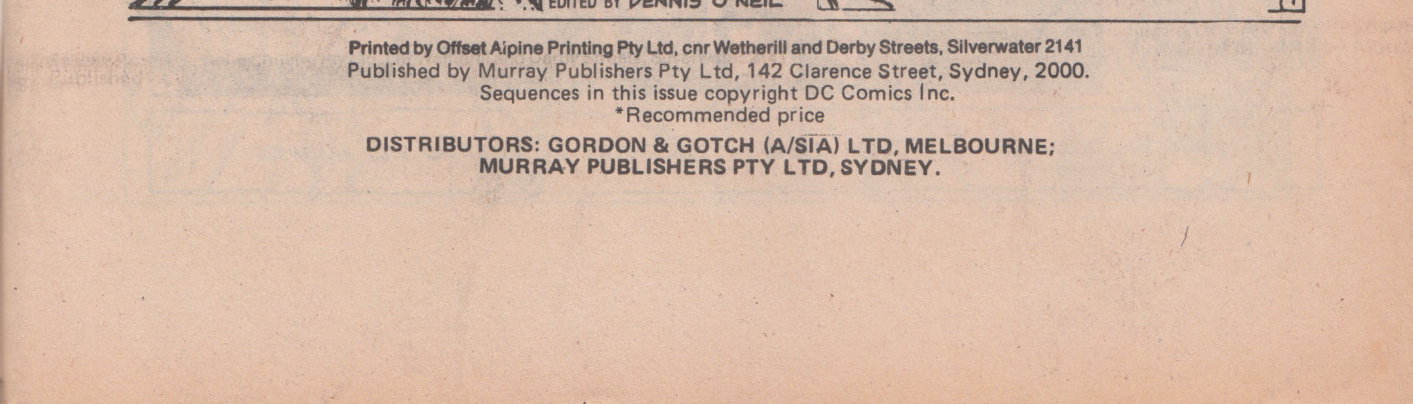 Printed by Offset Alpine Printing Pty Ltd, cnr Wetherill and Derby Streets, Silverwater 2141. Published by Murray Publishers Pty Ltd, 142 Clarence Street, Sydney, 2000. Sequences in this issue copyright DC Comics Inc. Distributors: Gordon & Gotch (A/sia) Ltd, Melbourne; Murray Publishers Pty Ltd, Sydney.