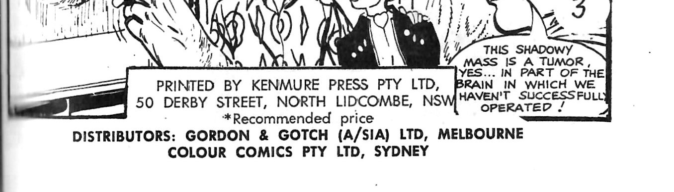 Printed by Kenmure Press Pty Ltd, 50 Derby Street, North Lidcombe, NSW. Distributors: Gordon & Gotch (A/sia) Ltd, Melbourne. Colour Comics Pty Ltd, Sydney.