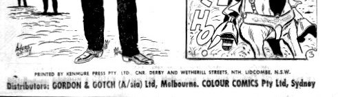 Printed by Kenmure Press Pty. Ltd., Cnr., Derby and Wetherill Streets Nth. Lidcombe, for the Proprietors Colour Comics Pty. Ltd., Sydney and produced by The K. G. Murray Publishing Company Pty. Ltd., 142 Clarence Street, Sydney. Gordon & Gotch (A'sia) Ltd., distributors for Australia and New Zealand. Sequences in this issue Copyright National Periodical Publications Inc.
