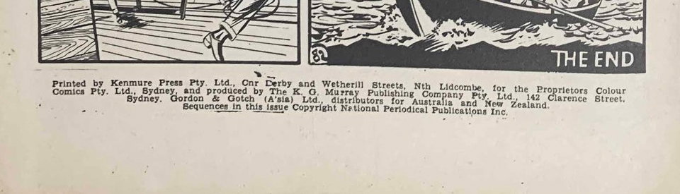 Printed y Kenmure Press Pty. Ltd., Cnr Derby and Wetherill Streets, Nth Lidcombe, for the Proprietors Colour Comics Pty. Ltd., Sydney, and produced by The K. G. Murray Publishing Company Pty. Ltd., 142 Calrence Street, Sydney. Gordon & Gotch (A'sia) Ltd., distributors for Australia and New Zealand. Sequences in this issue Copyright National Periodical Publications Inc.