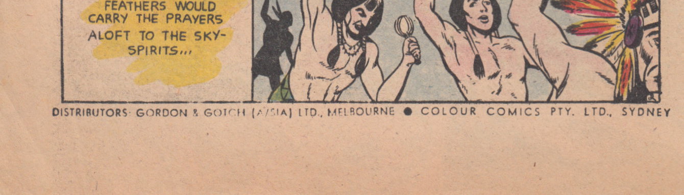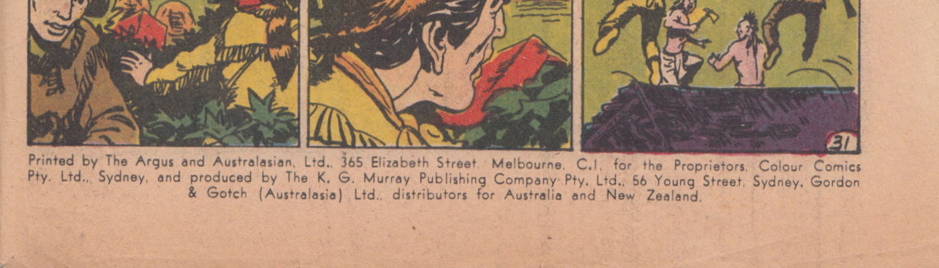 Printed by The Argus and Australasian, Ltd., 365 Elizabeth Street, Melbourne, C.1. for the proprietors, Colour Comics Pty. Ltd., Sydney, and produced by The K. G. Murray Publishing Company Pty. Ltd., 56 Young Street, Sydney. Gordon & Gotch (Australasia) Ltd., distributors for Australia and New Zealand.