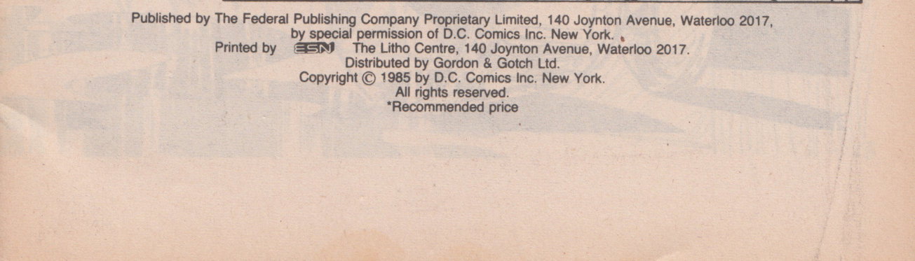 Published by The Federal Publishing Company Proprieary Limited, 140 Joynton Avenue, Waterloo 2017, by special permission of D.C. Comics Inc. New York. Printed by ESN The Litho Centre, 140 Joynton Avenue, Waterloo 2017. Distributed by Gordon & Gotch Ltd. Copyright © 1985 by D.C. Comics Inc. New York. All rights reserved.