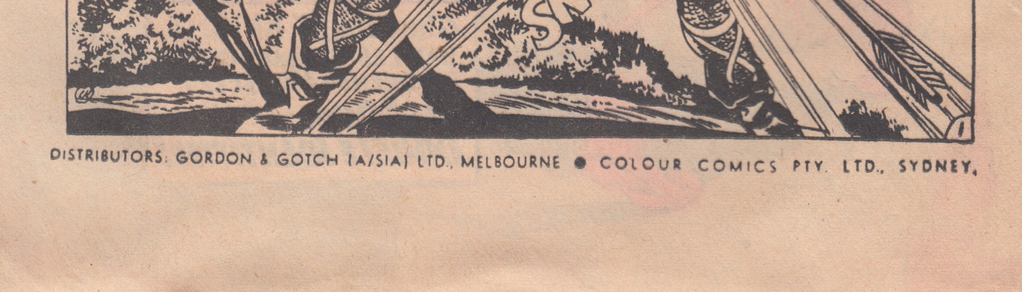 Printed by Mentmore Press, for the Proprietors, Colour Comics Pty. Ltd., Sydney, and produced by The K. G. Murray Publishing Company Pty. Ltd., 56 Young Street, Sydney. Gordon & Gotch (Australasia) Ltd., distributos for Australia and New Zealand.