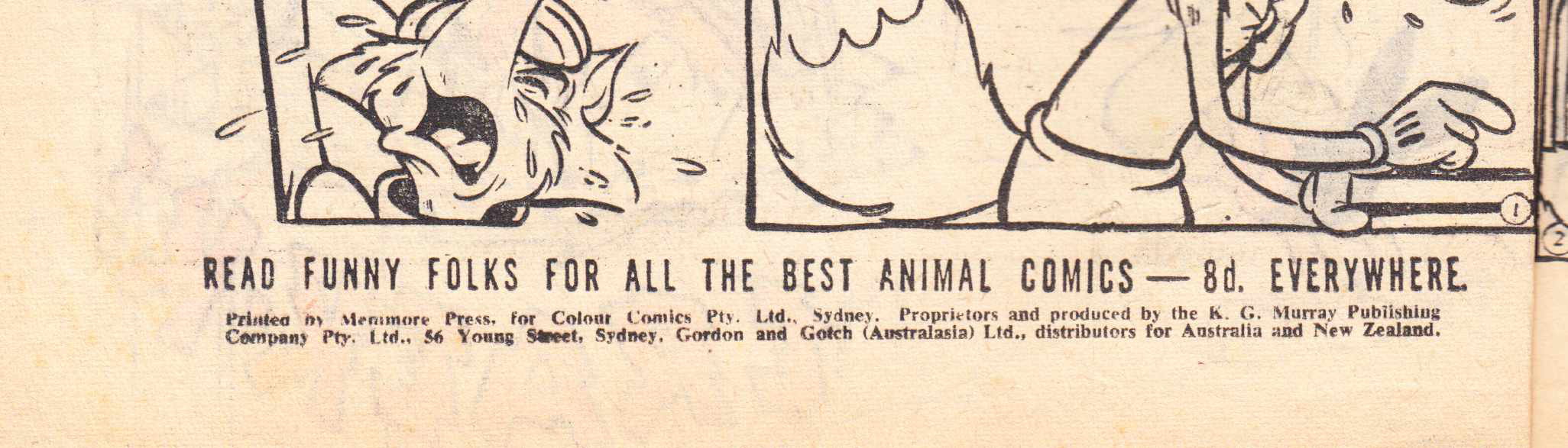 Printed by Mentmore Press for Colour Comics Pty. Ltd., Sydney, proprietors and produced by the K. G. Murray Publishing Company Pty. Ltd., 56 Young Street, Sydney. Gordon and Gotch (Australasia) Ltd., distributors for Australia and New Zealand.