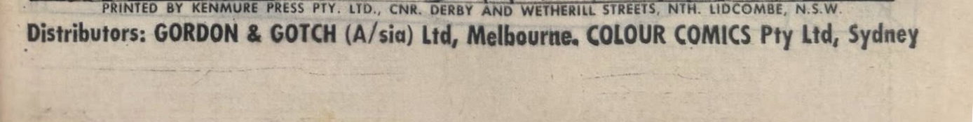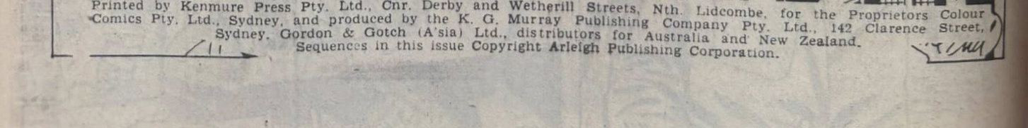 Printed by Kenmure Press Pty. Ltd., Cnr. Derby and Wetherill Streets, Nth. Lidcombe, for the Proprietors Colour Comics Pty. Ltd., Sydney, and produced by the K. G. Murray Publishing Company Pty. Ltd., 142 Clarence Street. Sequences in this issue Copyright Arleigh Publishing Corporation.