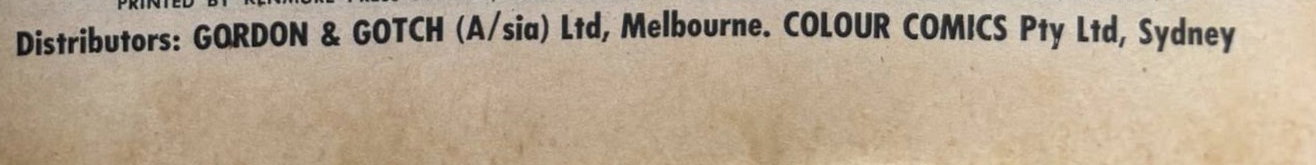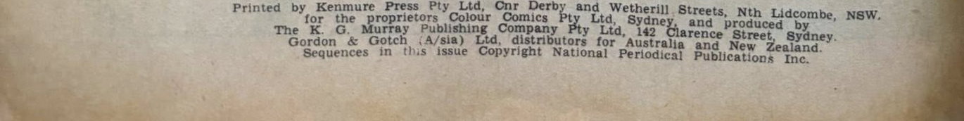Printed by Kenmure Press Pty Ltd, Cnr Derby and Wetherill Streets, Nth Lidcombe, NSW, for the proprietors Colour Comics Pty Ltd, Sydney, and produced by The K. G. Murray Publishing Company Pty Ltd, 142 Clarence Street, Sydney. Gordon & Gotch (A/sia) Ltd, distributors for Australia and New Zealand. Sequences in this issue copyright National Periodical Publications Inc.
