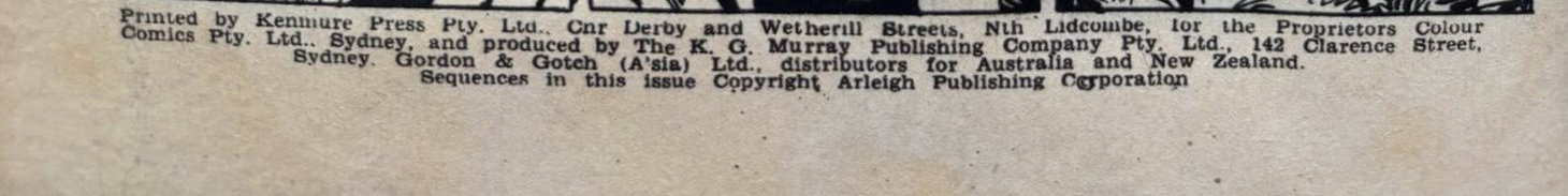 Printed by Kenmure Press Pty. Ltd., Cnr Derby and Wetherill Streets, Nth Lidcombe, for the Proprietors Colour Comics Pty. Ltd., Sydney, and produced by The K. G. Murray Publishing Company Pty. Ltd., 142 Clarence Street, Sydney. Gordon & Gotch (A'sia) Ltd., distributors for Australia and New Zealand. Sequences in this issue copyright Arleigh Publishing Corporation.
