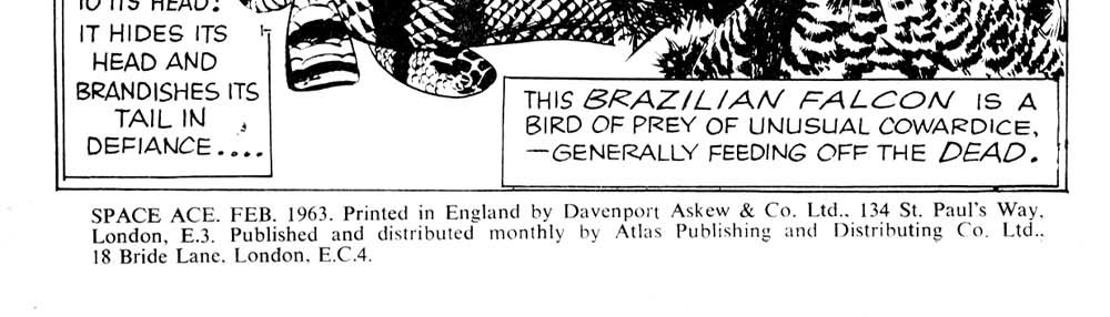SPACE ACE. FEB. 1963. Printed in England by Davenport Askew & Co. Ltd., 134 St. Paul's Way, London, E.3. Published and distributed monthly by Atlas Publishing and Disgtributing Co. Ltd., 18 bride Lane, London, E.C.4.