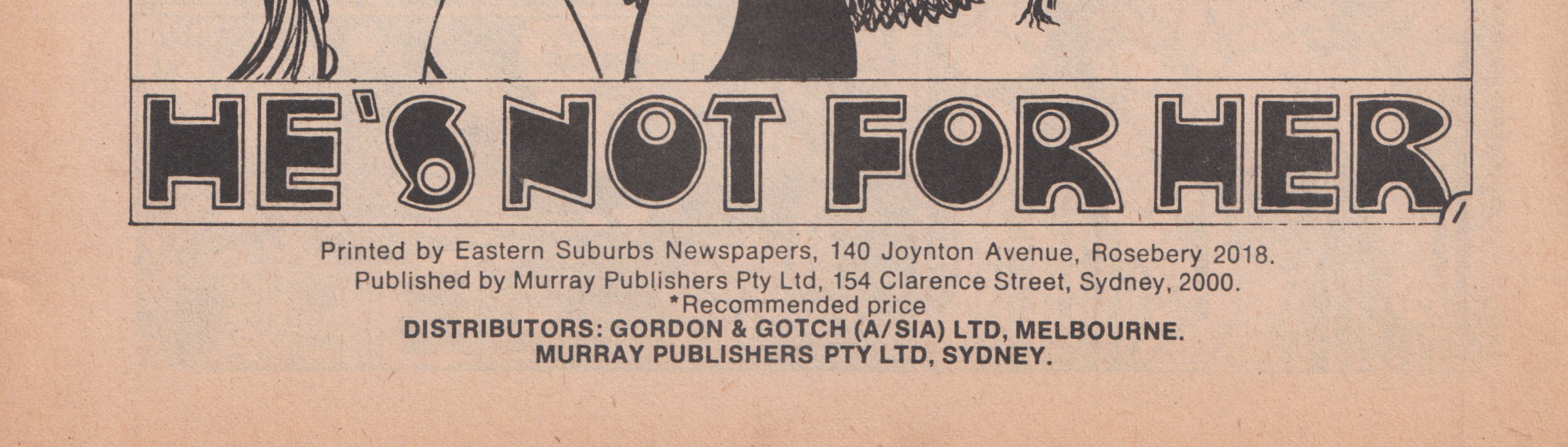 Printed by Eastern Suurbs Newspapers, 140 Joynton Avenue, Rosebery 2018. Published by Murray Publishers Pty Ltd, 154 Clarence Street, Sydney, 2000. Distributors: Gordon & Gotch (A/sia) Ltd, Melbourne, Murray Publishers Pty Ltd, Sydney.
