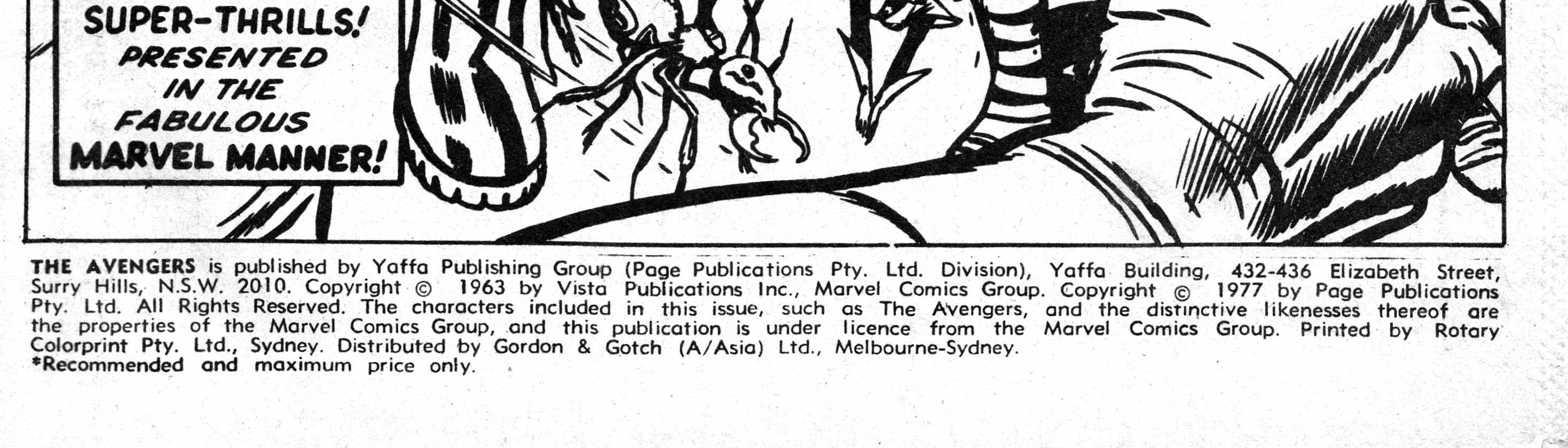 The Avengers is published by Yaffa Publishing Group (Page Publications Pty. Ltd. Division), Yaffa Building, 432-436 Elizabeth Street, Surry Hills, N.S.W. 2010. Copyright © by Vista Publications Inc., Marvel Comcis Group. Copyright © 1977 by Page Publications Pty. Ltd. All rights reserved. The characters included in this issue, such as The Avengers, and the distinctive likenesses thereof are the properties of the Marvel Comcis Group, and this publication is under licence from the Marvel Comics Group. Printed by Rogary Colorprint Pty. Ltd., Sydney. Distributed by Gordon & Gotch (A'Asia) Ltd., Melbourne-Sydney.