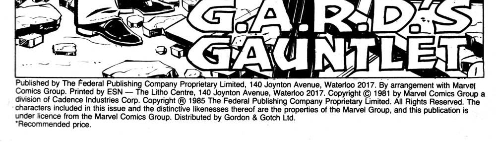 Published by The Federal Publishing Company Proprietary Limited, 140 Joynton Avenue, Waterloo 2017. By arrangement with Marvel Comics Group. Printed by ESN--The Litho Centre, 140 Joynton Avenue, Waterloo 2017. Copyright © 1981 by Marvel Comics Group a division of Cadence Industries Corp. copyright ® 1985 The Federal Publishing Company Proprietary Limited. All Rights Reserved. The characters included in this issue and the distinctive likenesses thereof are the properties of the Marvel Group, and this publication is under licence from the Marvel Comics Group. Distributed by Gordon & Gotch Ltd.