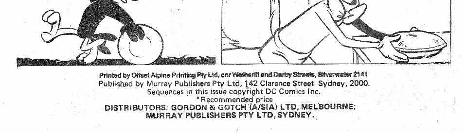 Printed by Offset Alpine Printing Pty Ltd, cnr Wetherill and Derby Streets, Silverwater 2141. Published by Murray Publishers Pty Ltd, 142 Clarence Street Sydney, 2000. Sequences in this issue copyright DC Comics Inc. Distributors: Gordon & Gotch (A/sia) Ltd, Melbourne; Murray Publishers Pty Ltd, Sydney.