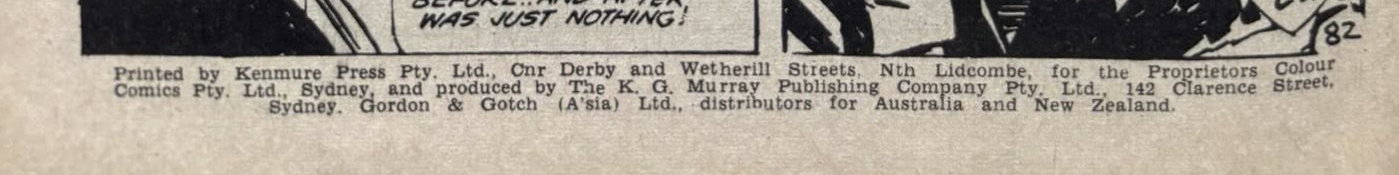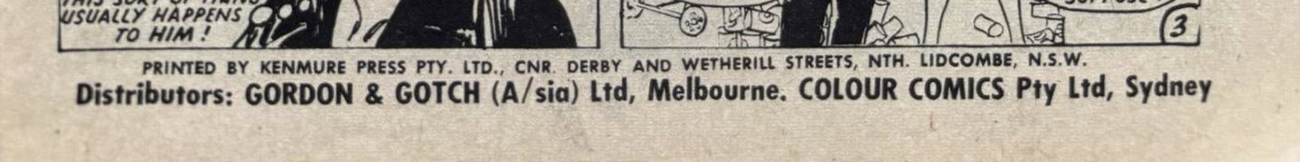 Printed by Kenmure Press Pty. Ltd., Cnr Derby and Wetherill Streets, Nth Lidcombe, for the Proprietors Colour Comics Pty. Ltd., Sydney, and produced by The K. G. Murray Publishing Company Pty. Ltd., 142 Clarence Street, Sydney. Gordon & Gotch (A'sia) Ltd., distributors for Australia and New Zealand.