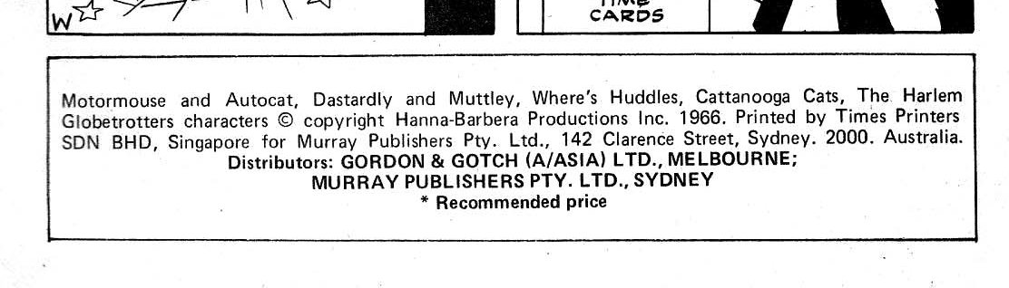 Motormouse and Autocat, Dastardly and Muttley, Where's Huddles, Cattanooga Cats, The Harlem Globetrotters characters © copyright Hanna-Barbera Productions Inc. 1966. Printed by Times Printers SDN BHD, Singapore for Murray Publishers Pty. Ltd., 142 Clarence Street, Sydney. 2000. Australia. Distributors: Gordon & Gotch (A/asia) Ltd., Melbourne; Murray Publishers Pty. Ltd., Sydney.