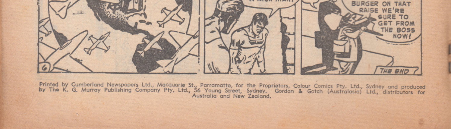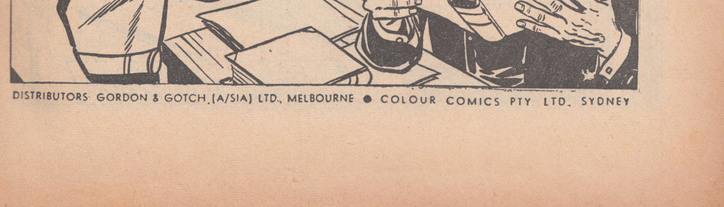 Printed by Cumberland Newspapers Ltd., Macquarie St., Parramatta, for the Proprietors, Colour Comics Pty. Ltd., Sydney and produced by The K. G. Murray Publishing Company Pty. Ltd., 56 Young Street, Sydney. Gordon & Gotch (Australasia) Ltd., distributors for Australia and New Zealand.