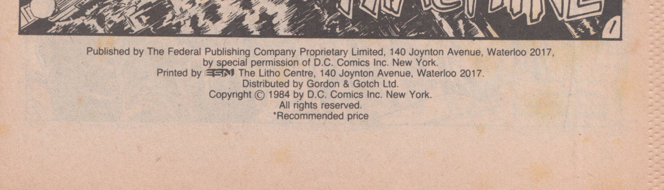 Published by The Federal Publishing Company Proprietary Limited, 140 Joynton Avenue, Waterloo 2017, by special permission of D.C. Comics Inc. New York. Printed by ESN The Litho Centre, 140 Joynton Avenue, Waterloo 2017. Distributed by Gordon & Gotch Ltd. Copyright © 1984 by D.C. Comics Inc. New York. All rights reserved.