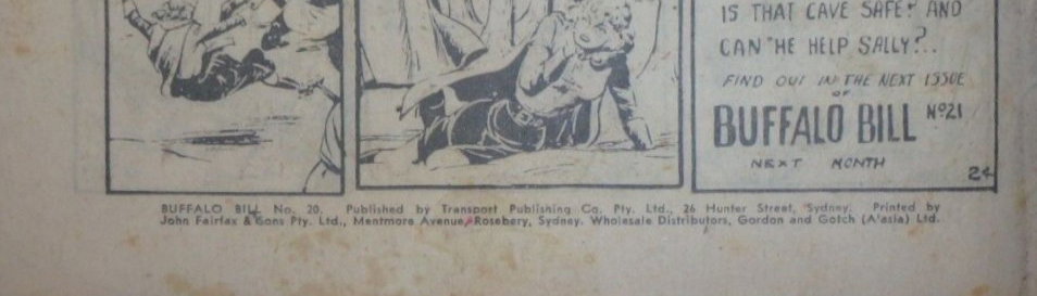 Buffalo Bill No. 20. Published by Transport Publishing Co. Pty. Ltd., 26 Hunter Street, Sydney. Printed by John Fairfax & Sons Pty. Ltd., Mentmore Avenue, Rosebery, Sydney. Wholesale Distributors, Gordon and Gotch (A'asia) Ltd.