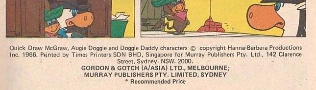 Quick Draw McGraw, Augie Doggie and Doggie Daddy characters © Hanna-Barbera Productions Inc. 1966. Printed by Times Printers SDN BHD, Singapore for Murray Publishers Pty. Ltd., 142 Clarence Street, Sydney, NSW, 2000. Gordon & Gotch (A/asia) Ltd., Melbourne; Murray Publishers Pty, Limited, Sydney.