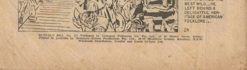 Buffalo Bill No. 27: Published by Transport Publishing Co. Pty. Ltd., of 26 Hunter Street, Sydney. Printed in Australia by Mentmore Colour Productions Pty. Ltd., 49-59 Mentmore Avenue, Rosebery, N.S.W. Wholesale Distributors: Gordon and Gotch (A'asia) Ltd.