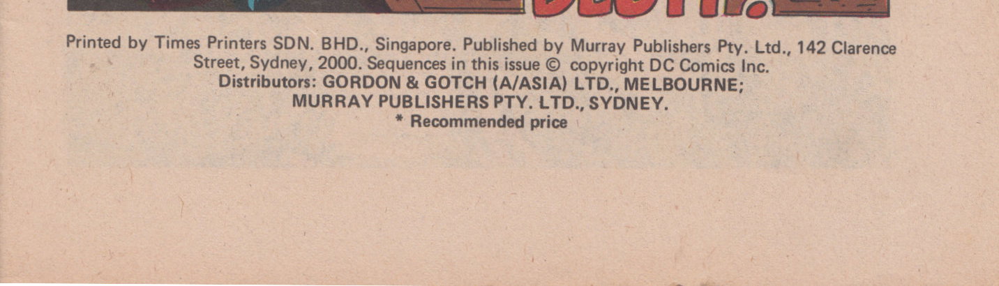 Printed by Times Printers SDN. BHD., Singapore. Published by Murray Publishers Pty. Ltd., 142 Clarence Street, Sydney, 2000. Sequences in this issue © copyright DC Comics Inc. Distributors: Gordon & Gotch (A/asia) Ltd., Melbourne; Murray Publishers Pty. Ltd., Sydney.