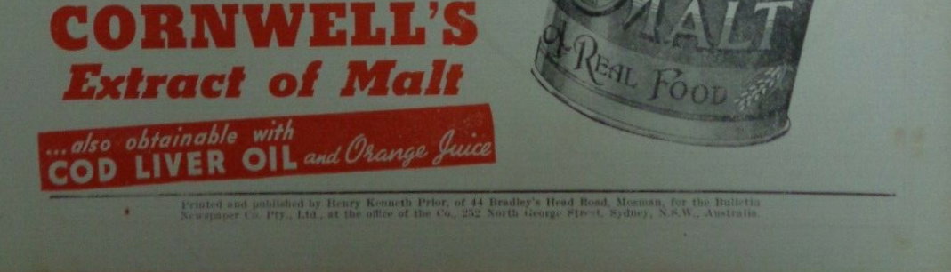 Printed and published by Henry Kenneth Prior, of 44 Bradley's Head Road, Mosman, for the Bulletin Newspaper Co. Pty. Ltd., at the office of the Co., 252 North George Street, Sydney, N.S.W., Australia.