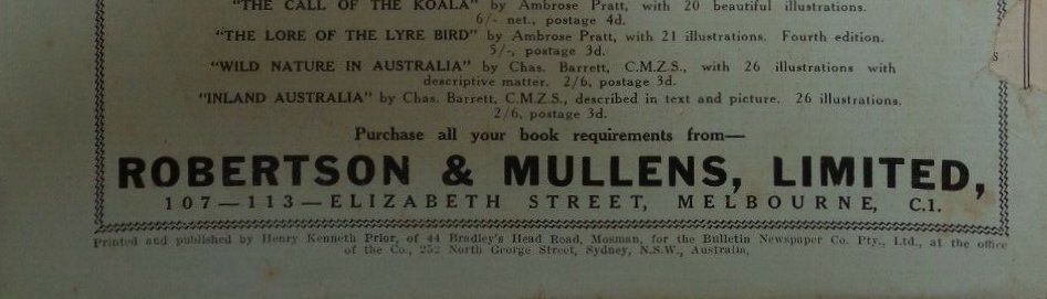 Printed and published by Henry Kenneth Prior, of 44 Bradley's Head Road, Mosman, for the Bulletin Newspaper Co. Pty. Ltd., at the office of the Co., 252 North George Street, Sydney, N.S.W., Australia.