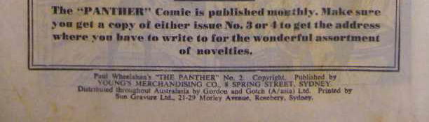 Paul Wheelahan's "The Panther" No. 2. Copyright. Published by Young's Merchandising Co., 8 Spring Street, Sydney. Distributed throughout Australasia by Gordon and Gotch (A/asia) Ltd. Printed by Sun Gravure Ltd., 21-29 Morely Avenue, Rosebery, Sydney.