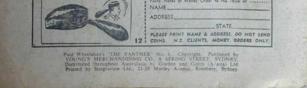 Paul Wheelahan's "The Panther" No. 4. Copyright. Published by Young's Merchandising Co., 8 String Street, Sydney. Distributed throughout Australasia by Gordon and Gotch (A/asia) Ltd. Printed by Sundrabure Ltd., 21-29 Moreley Avenue, Rosebery, Sdyney.