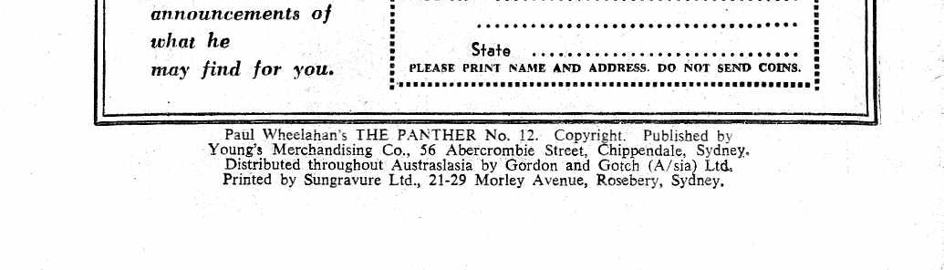 Paul Wheelahan's THE PANTHER No. 12. Copyright. Published by Young's Merchendising Co., 56 Abercrombie Street, Chippendale, Sydney. Distributed throughout Australia by Gordon and Gotch (A/sia) Ltd. Printed by Sungrauve Ltd., 21-29 Morley Avenue, Rosebery, Sydney.