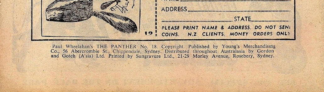 Paul Wheelahan's The Panther No. 18. Copyright. Published by Young's Merchandising Co., 56 Abercrombie St., Chippendale, Sydney. Distributed throughout Australasia by Gordon and Gotch (A'sia) Ltd. Printed by Sungravure Ltd., 21-29 Morley Avenue, Rosebery, Sydney.