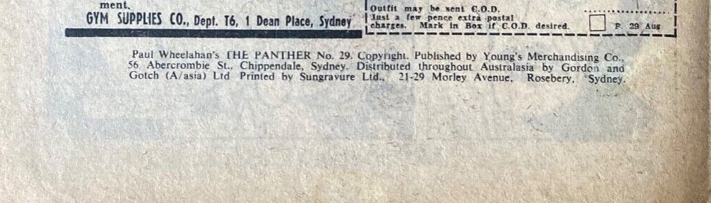 Paul Wheelahan's The Panther No. 29. Copyright. Published by Young's Merchandising Co., 56 Abercrombie St., Chippendale, Sydney. Distributed throughout Australasia by Gordon and Gotch (A/asia) Ltd. Printed by Sungravure Ltd., 21-29 Moreley Avenue, Rosebery, Sydney.