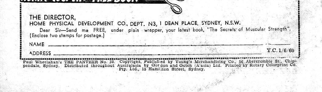 Paul Wheelahan's The Panther No. 38. Copyright. Published by Young's Merchandising Co., 56 Abercrombie St., Chippendale, Sydney. Distributed throughout Australasia by Gordon and Gotch (A'asia) Ltd. Printed by Rotary Colorprint Co. Pty. Ltd., 15 Hamilton Street, Sydney.