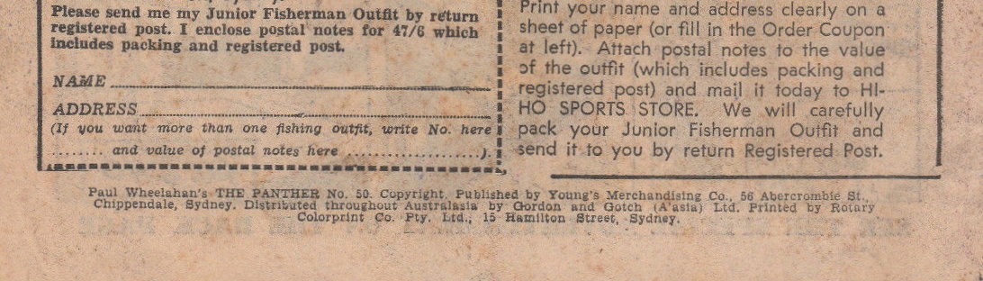 Paul Wheelahan's The Panther No. 50. Copyright. Published by Young's Merchandising Co., 56 Abercrombie St., Chippendale, Sydney. Distributed throughout Australasia by Gordon and Gotch (A'asia) Ltd. Printed by Rotary Colorprint Co. Pty. Ltd., 15 Hamilton Street, Sydney.