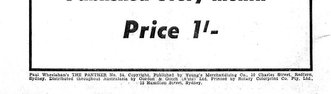 Paul Wheelahan's The Panther No. 54. Copyright. Published by Young's Merchandising Co., 10 Chrles Street, Redfern, Sydney. Distributed throughout Australasia by Gordon & Gotch (A'sia) Ltd. Printed by Rotary Colorprint Co. Pty. Ltd., 15 Hamilton Street, Sydney.