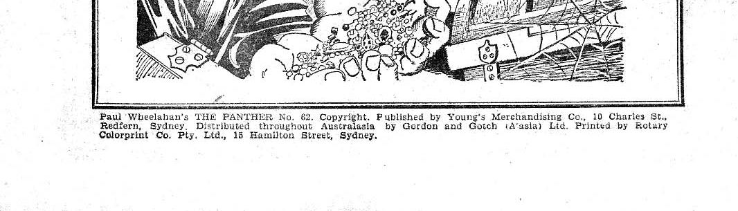 Paul Wheelahan's The Panther No. 62. Copyright. Published by Young's Merchandising Co., 10 Charles St., Redfern, Sydney. Distributed throughout Australasia by Gordon and Gotch (A'asia) Ltd. Printed by Rotary Colorprint Co. Pty. Ltd., 15 Hamilton Street, Sydney.