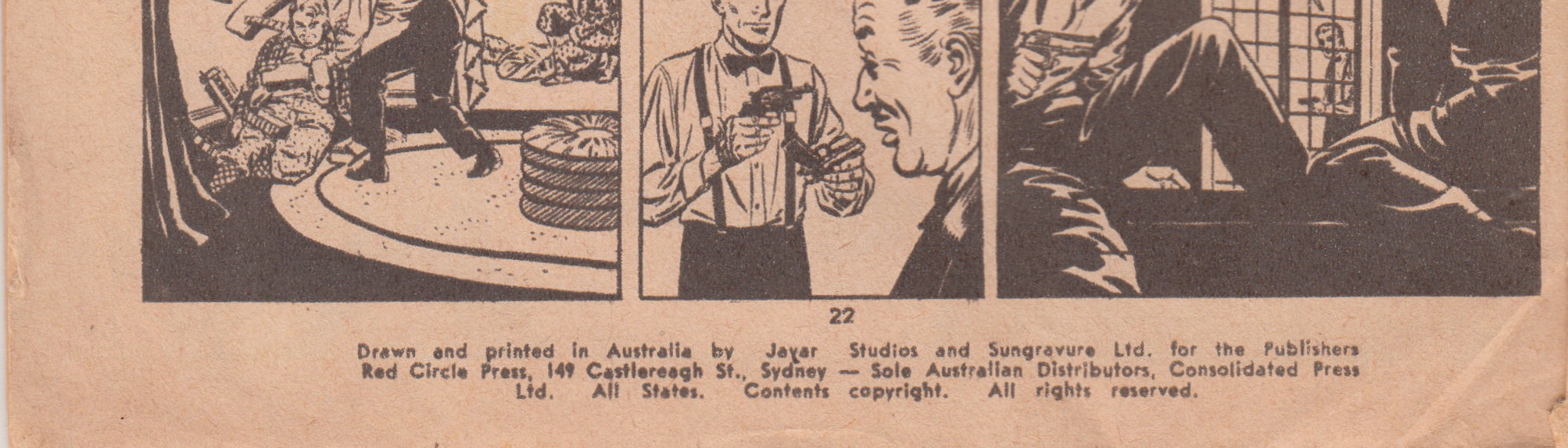 Drawn and printed in Australia by Jayar Studios and Sungravure Ltd. for the Publishers Red Circle Press, 149 Castlereagh St., Sydney -- Sole Australian Distributors, Consolidated Press Ltd. All states. Contents copyright. All rights reserved.
