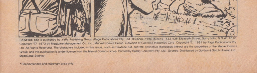 Rawhide Kid is published by Yaffa Publishing Group (Page Publications Pty. Ltd. Division), Yaffa Building, 432-436 Elizabeth Street, Surry Hills, N.S.W. 2010. Copyright © 1972 by Magazine Management Co. Inc., Marvel Comics Group, a division of Cadence Industries Corp. Copyright © 1981 by Page Publications Pty Ltd. All rights reserved. The characters included in this issue, such as Rawhide Kid, and the distinctive likenesses thereof are the properties of the Marvel Comics Group, and this publication is under licence from the Marvel Comics Group. Printed by Rotary Colorprint Pty. Ltd., Sydney, Distributed by Gordon & Gotch (A/asia) Ltd., Melbourne-Sydney.