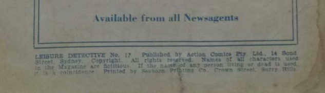 Leisure Detective No. 17. Published by Action Comics Pty. Ltd., 14 Bond Street, Sydney. Copyright. All rights reserved. Names of all characters used in the magazine are fictitious. If the name of any person living or dead is used, it is a coincidence. Printed by Seaborn Printing Co., Crown Street, Surry Hills. [On last story page:] Printed by "Truth" and "Sportsman" Ltd, corner Kippax and Hold Streets, Sydney, for the Publisher.