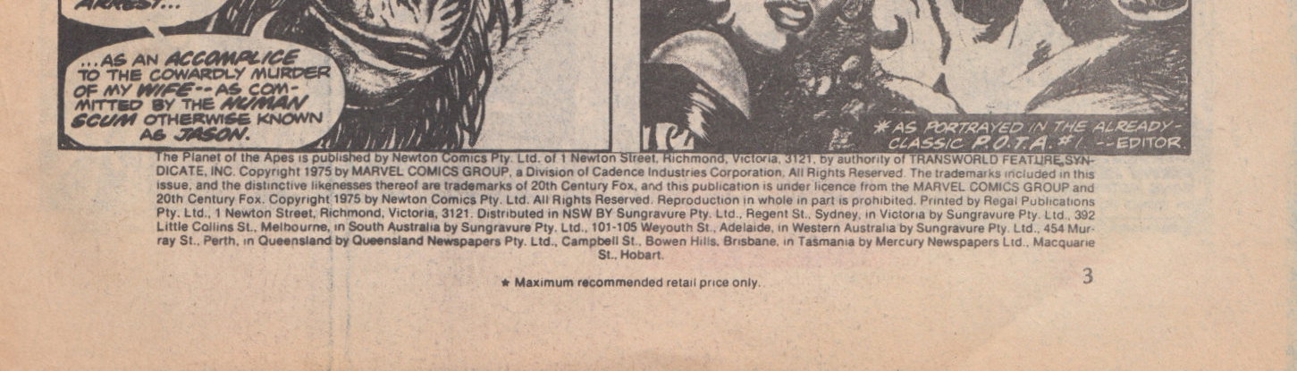 The Planet of the Apes is published by Newton Comics Pty. Ltd. of 1 Newton Street, Richmond, Victoria, 3121, by authority of Transworld Feature Syndicted, Inc. Copyright 1975 by Marvel Comics Group, a Division of Cadence Industries Corporation…