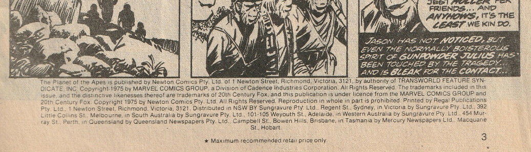 The Planet of the Apes is published by Newton Comics Pty. Ltd. Of 1 Newton Street, Richmond, Victoria, 3121, by authority of TRANSWORLD FEATURE SYNDICATE, INC. Copyright 1975 by MARVEL COMICS GROUP, a Division of Cadence Industries Corporation. All rights Reserved. The trademarks included in this issue and the distinctive likenesses thereof are trademarks of 20th Century Fox, and this publication is under licence from the MARVEL COMICS GROUP and 20th Century Fox. Copyright 1975 by Newton Comics Pty. Ltd. All rights Reserved. Reproduction in whole in part is prohibited. Printed by Regal Publications Pty. Ltd., 1 Newton Street, Richmond, Victoria, 3121. Distributed in NSW BY Sungravure Pty. Ltd., Regent St., Sydney, in Victoria by Sungravure Pty. Ltd., 392 Little Collins St., Melbourne, in South Australia by Sungravure Pty. Ltd., 101-105 Weyouth St., Adelaide, in Western Australia by Sungravure Pty. Ltd. 454 Murray St., Perth, in Queensland by Queensland Newspapers Pty. Ltd., Campbell St., Bowen Hills, Brisbane, in Tasmania by Mercury Newspapers Ltd., Macquarie St., Hobart.