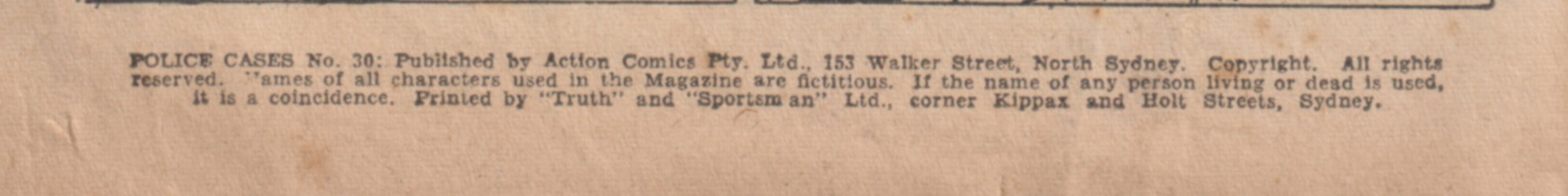 Police Cases No. 30. Published by Action Comics Pty. Ltd., 153 Walker Street, North Sydney. Copyright. All rights reserved. Names of all characters used in the magazine are fictitious. If the name of any person living or dead is used, it is a coincidence. Printed by "Truth" and "Sportsman" Ltd., corner Kippax and Holt Streets, Sydney.