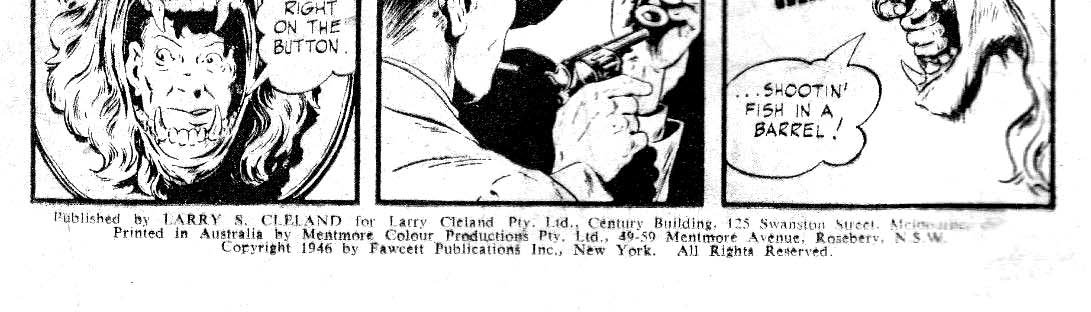Published by Larry S. Cleland for Larry Cleland Pty. Ltd., Century Building 125 Swanston Street, Melbourne. Printed in Australia by Mentmore Colour Productions Pty. Ltd., 49-59 Mentmore Avenue, Rosebery, N.S.W. Copyright 1946 by Fawcett Publications Inc., New York. All rights reserved.