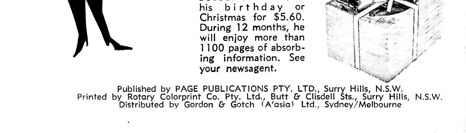 Published by Page Publications Pty. Ltd. and printed by Rotary Colorprint Co. Pty. Ltd. Both of Butt and Clisdell Streets, Surry Hills, N.S.W. 2010. Distributed by Gordon & Gotch Ltd., Melbourne-Sydney.