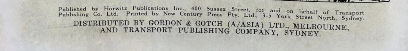 Published by Horwitz Publications Inc., 400 Sussex Street, for and on behalf of Transport Publishing Co. Ltd. Printed by New Century Press Pty. Ltd., 305 York Street North, Sydney. Distributed by Gordon & Gotch (A/asia) Ltd., Melbourne, and Transport Publishig Company, Sydney.