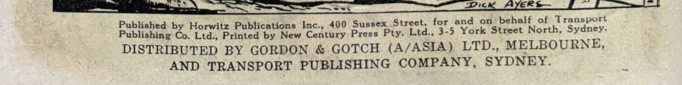 Published by Horwitz Publications Inc., 400 Sussex Street, for and on behalf of Transport Publishing Co. Ltd., Printed by New Century Press Pty. Ltd., 3-5 York Street North, Sydney. Distributed by Gordon & Gotch (A/asia) Ltd., Melbourne, and Transport Publishing Company, Sydney.