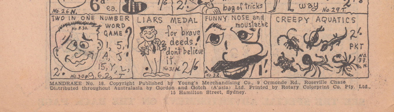 Mandrake No. 18. Copyright. Published by Young's Merchandising Co., 9 Ormonde Rd., Roseville Chase. Distributed throughout Australasia by Gordon and Gotch (A'asia) Ltd. Printed by Rotary Colorprint Co. Pty. Ltd., 15 Hamilton Street, Sydney.