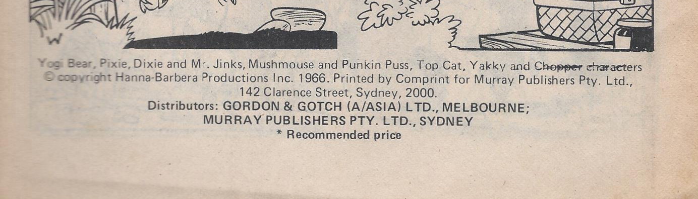 Yogi Bear, Pixie, Dixie and Mr. Jinks, Mushmouse and Punkin Puss, Top Cat, Yakky and Chopper characters © copyright Hanna-Barbera Productions Inc. 1966. Printed by Comprint for Murray Publishers Pty. Ltd., 142 Clarence Street, Sydney, 2000. Distributors: Gordon & Gotch (A/asia) Ltd., Melbourne; Murray Publishers Pty. Ltd., Sydney.