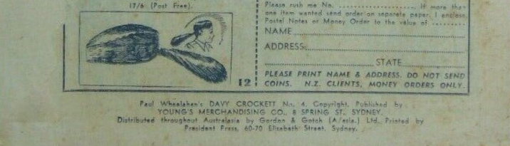Paul Wheelahan's Davy Crockett No. 4. Copyright. Published by Young's Merchandising Co., 8 Spring St., Sydney. Distributed throughout Australasia by Gordon & Gotch (A/asia) Ltd. Printed by President Press, 60-70 Elizabeth Street, Sydney.